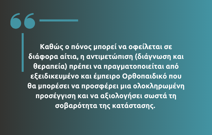 Καθώς ο πόνος μπορεί να οφείλεται σε διάφορα αίτια, η αντιμετώπιση (διάγνωση και θεραπεία) πρέπει να πραγματοποιείται από εξειδικευμένο και έμπειρο Ορθοπαιδικό που θα μπορέσει να προσφέρει μια ολοκληρωμένη προσέγγιση και να αξιολογήσει σωστά τη σοβαρότητα της κατάστασης. Μετά την καταγραφή του ιατρικού ιστορικού, ο ασθενής υποβάλλεται σε κλινική εξέταση. Κατά την εξέταση καταγράφεται η εντόπιση και τα χαρακτηριστικά του πόνου, η ύπαρξη ευαισθησίας, υδράρθρου, ερυθρότητας και θερμότητας στην άρθρωση και αξιολογείται η σταθερότητα και η το εύρος κίνησης της άρθρωσης. Πολύ σημαντικό ρόλο στη διάγνωση έχει ο απεικονιστικός έλεγχος, οποίος μπορεί να περιλαμβάνει ακτινογραφίες, μαγνητική τομογραφία ή/και πιο εξιδεικευμένες εξετάσεις ανάλογα με την περίπτωση. Τέλος, εφόσον κριθεί απαραίτητο, μπορεί να απαιτηθούν εργαστηριακές – αιματολογικές εξετάσεις για φλεγμονώδη ή μεταβολικά νοσήματα.